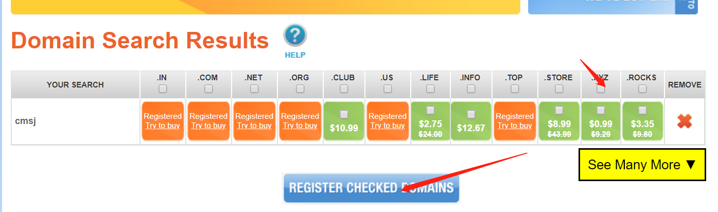 在你想要注册的后缀前面打√,推荐com,之后点击REGISTER CHECKED DOMAINS: