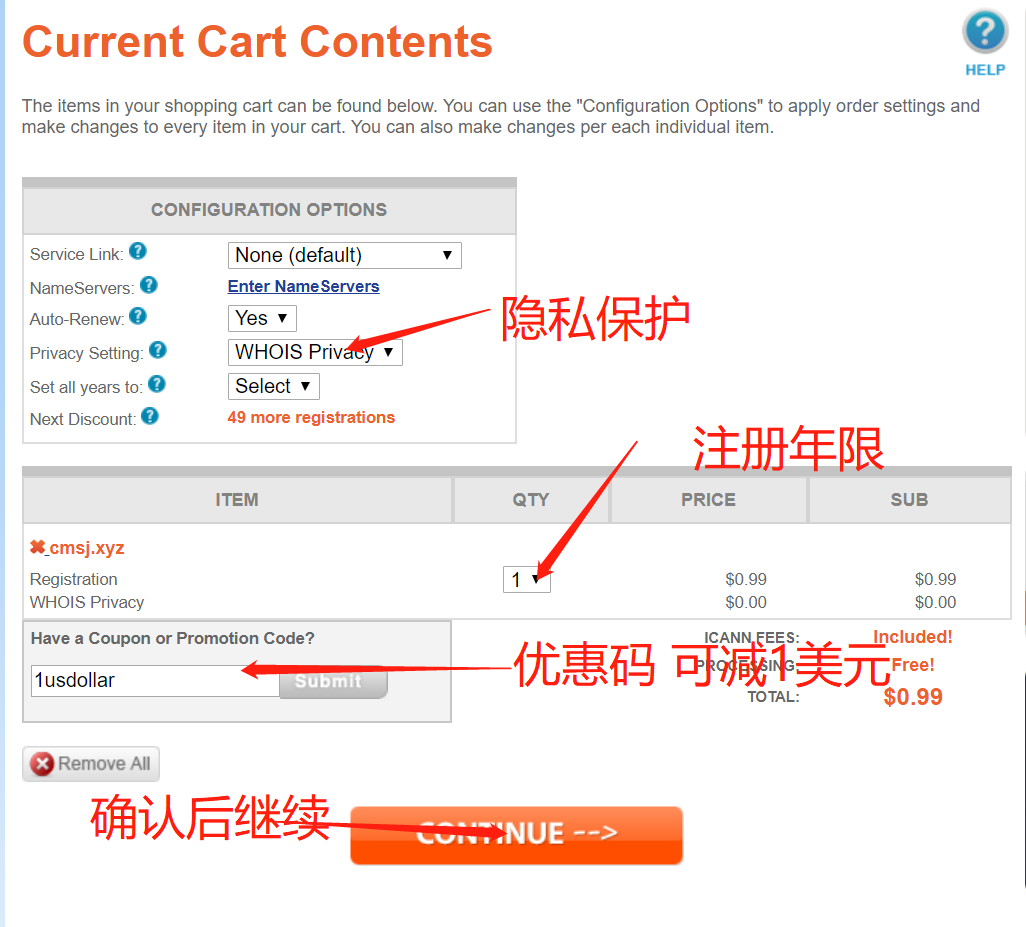如上图所示,可以设置域名的参数。在下方优惠码提交栏可以输入优惠码,之后点击Submit,可以减1刀。再次送上1美元的优惠券 1usdollar